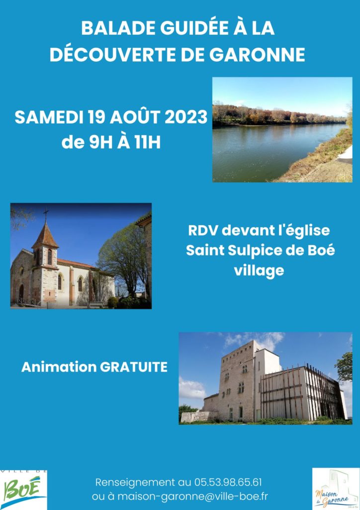 Départ : Église Saint Sulpice, Boé village.Balade de 2h environ – 20 mn de marche.Renseignements au 05 53 98 65 61 ou maison-garonne@ville-boe.fr