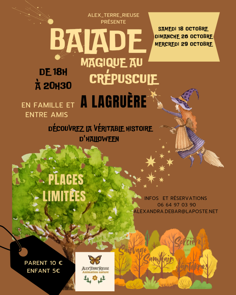 En cette saison automnale, voici une balade semi-nocturne où se mêleront découverte de la flore des sorcières et ses légendes, écoute (et/ou observation) de la faune sauvage à la tombée de la nuit, créations nature ….