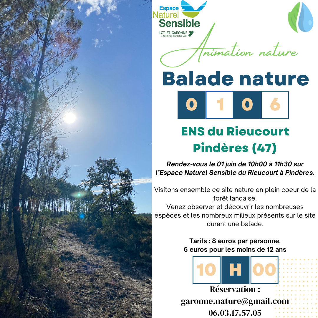 Rendez-vous le 1er juin de 10h à 11h30 sur l’Espace Naturel Sensible du Rieucourt à Pindères.Visitons ensemble ce site nature en plein coeur de la forêt landaise.Venez observer et découvrir les nombreuses espèces et les nombreux milieux présents sur le site durant une balade.Réservation en ligne ou par mail : garonne.nature@gmail.com ou par téléphone au 06 03 17 57 05.