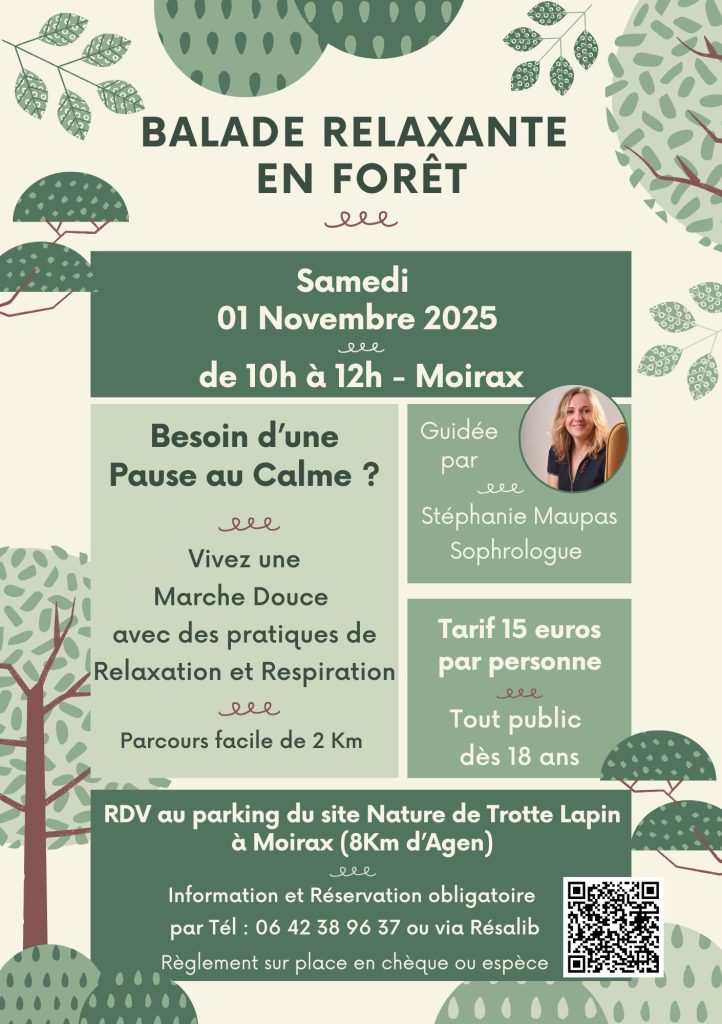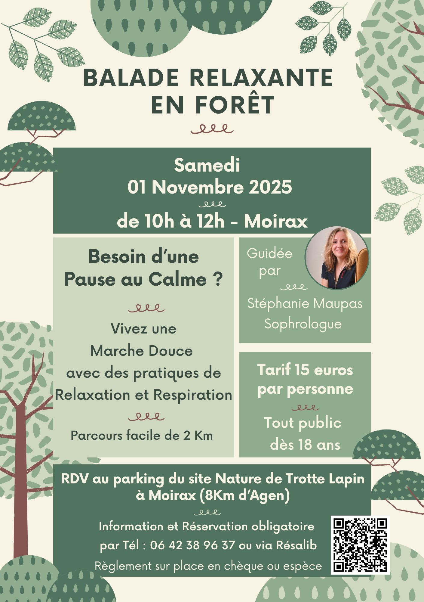 Marche douce et pratiques de relaxation guidée par la sophrologue Stéphanie Maupas sur un parcours doux de 2 km en forêt bordée d’un ruisseau.