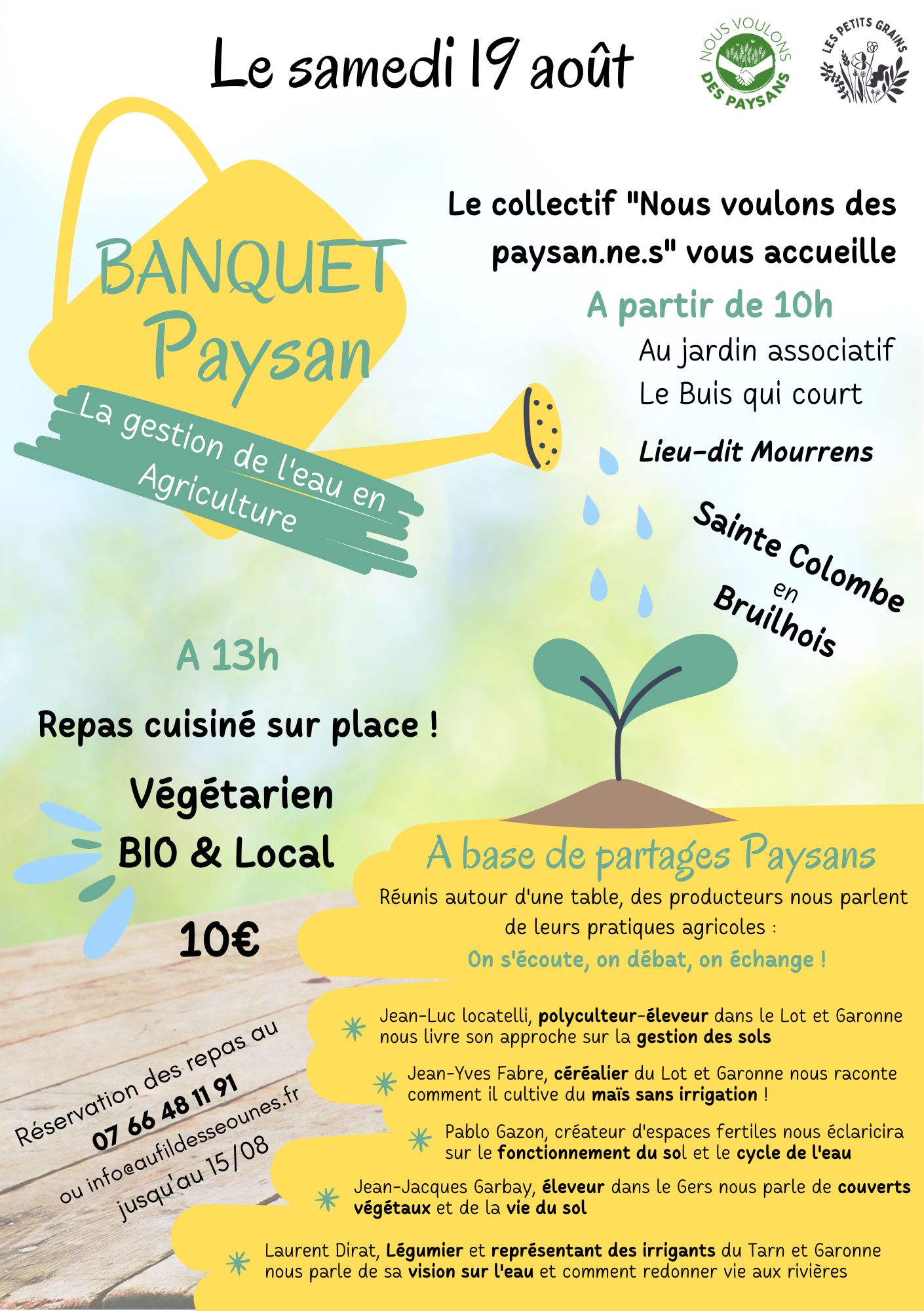 Le collectif organise sa première édition du Banquet Paysan avec l’aide précieuse du collectif du Gers et l’accueil toujours chaleureux des Petits GrainsQu’est ce qu’un banquet paysan ?