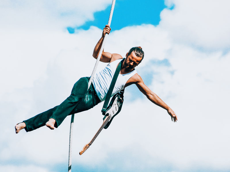 Acrobatie aérienne, humour et guitare virtuose, c’est le programme décoiffant de cette