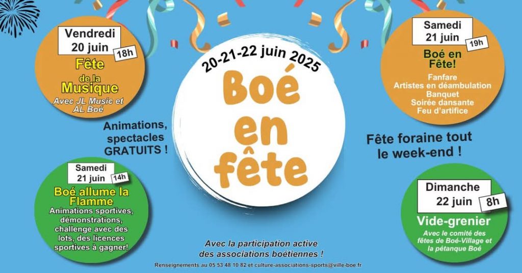 Du vendredi 20 au dimanche 22 juin, de la plaine sportive de Cancelles à l’espace culturel François Mitterrand, les animations et autres moments conviviaux seront les rois de la fête. La ville de Boé et les associations festives et sportives de la commune se sont unies pour ce week-end plein de surprises, où les animations et spectacles seront gratuits !