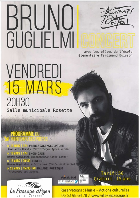 Bruno Glugliemi vient de signer la dernière chanson interprétée par Aldebert pour la Bande Originale du film d’animation Pat’patrouille en 2023 ou encore d’écrire certains textes des derniers albums de Florent Pagny, Calogero, Patrick Fiori, Julien Clerc ou encore Maxime Le Forestier. Après plusieurs jours d’écriture avec les élèves de cm1 et cm2 de l’école élémentaire Ferdinand Buisson il viendra présenter, accompagné de ses guitares, ses chansons et celles écrites en classe avec les enfants.Sur réservation au 05 53 98 64 78.
