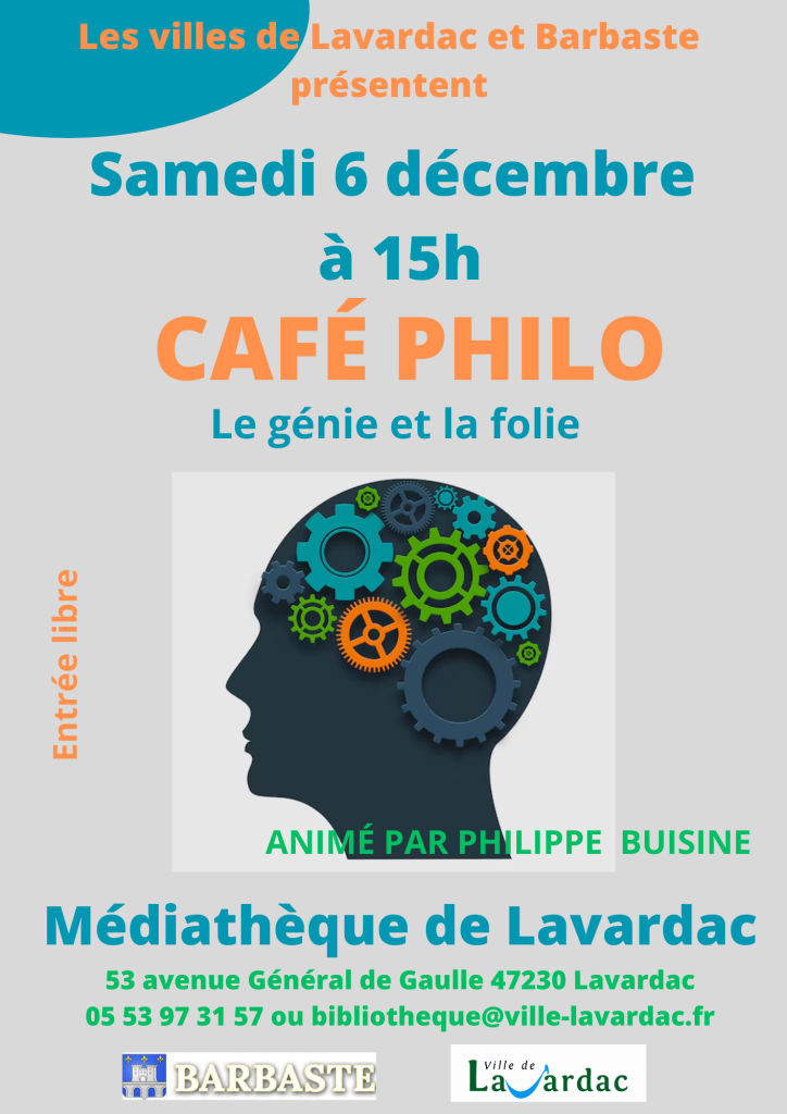Dans le cadre du partenariat culturel entre Barbaste et Lavardac, un Café Philo aura lieu le 6 décembre à 15h, à la Médiathèque de Lavardac. Thème : Le génie et la folie.