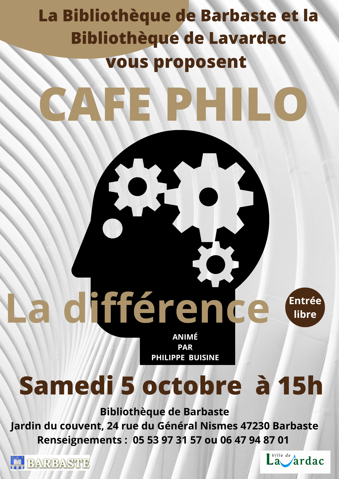 Dans le cadre du partenariat culturel entre Barbaste et Lavardac, un Café Philo aura lieu le 5 octobre à 15 h à la bibliothèque de Barbaste.