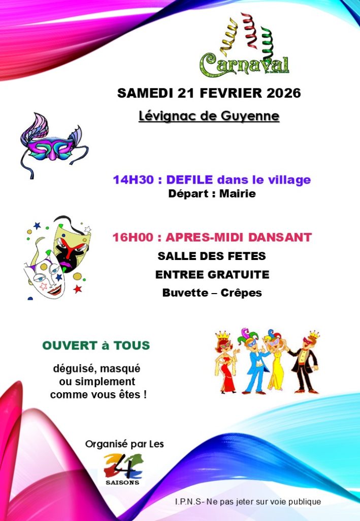 Venez défiler dans les rues de Lévignac (Départ de la Mairie), à 14h30 et profiter d’une après-midi dansante, à la Salle des Fêtes, à partir de 16h.