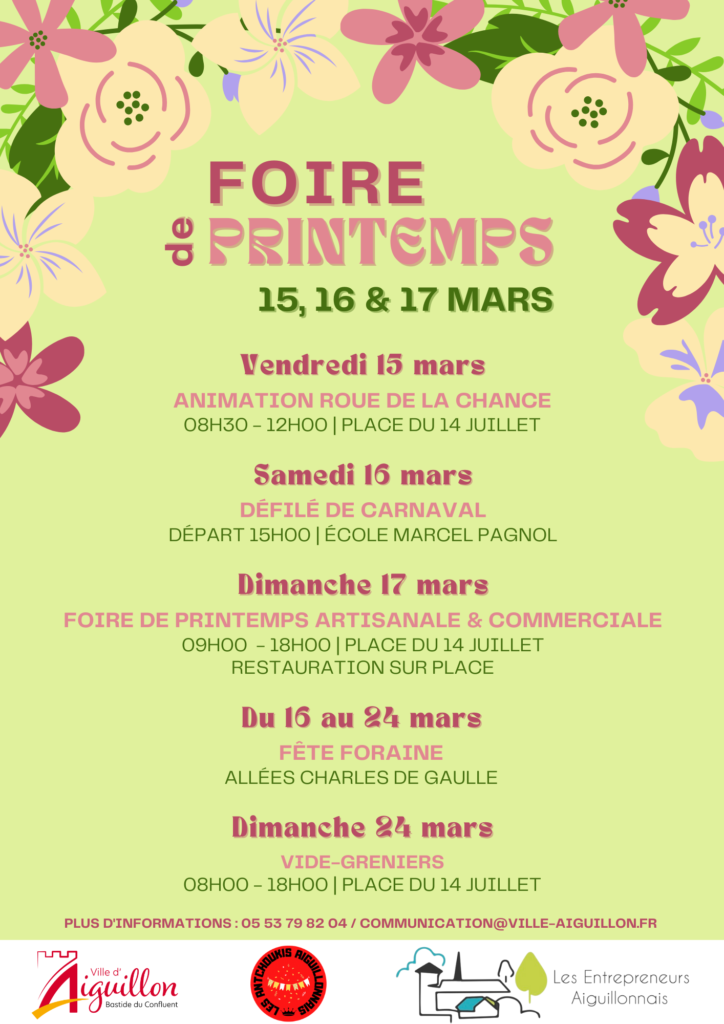 Dimanche 17 marsFoire de Printemps artisanale & commerciale organisée par la Ville d’AiguillonDe 9h à 18h, Place du 14 Juillet11h30 : InaugurationRestauration sur place par M’happy Crêpe (Réservation conseillée au 07 66 42 91 97)