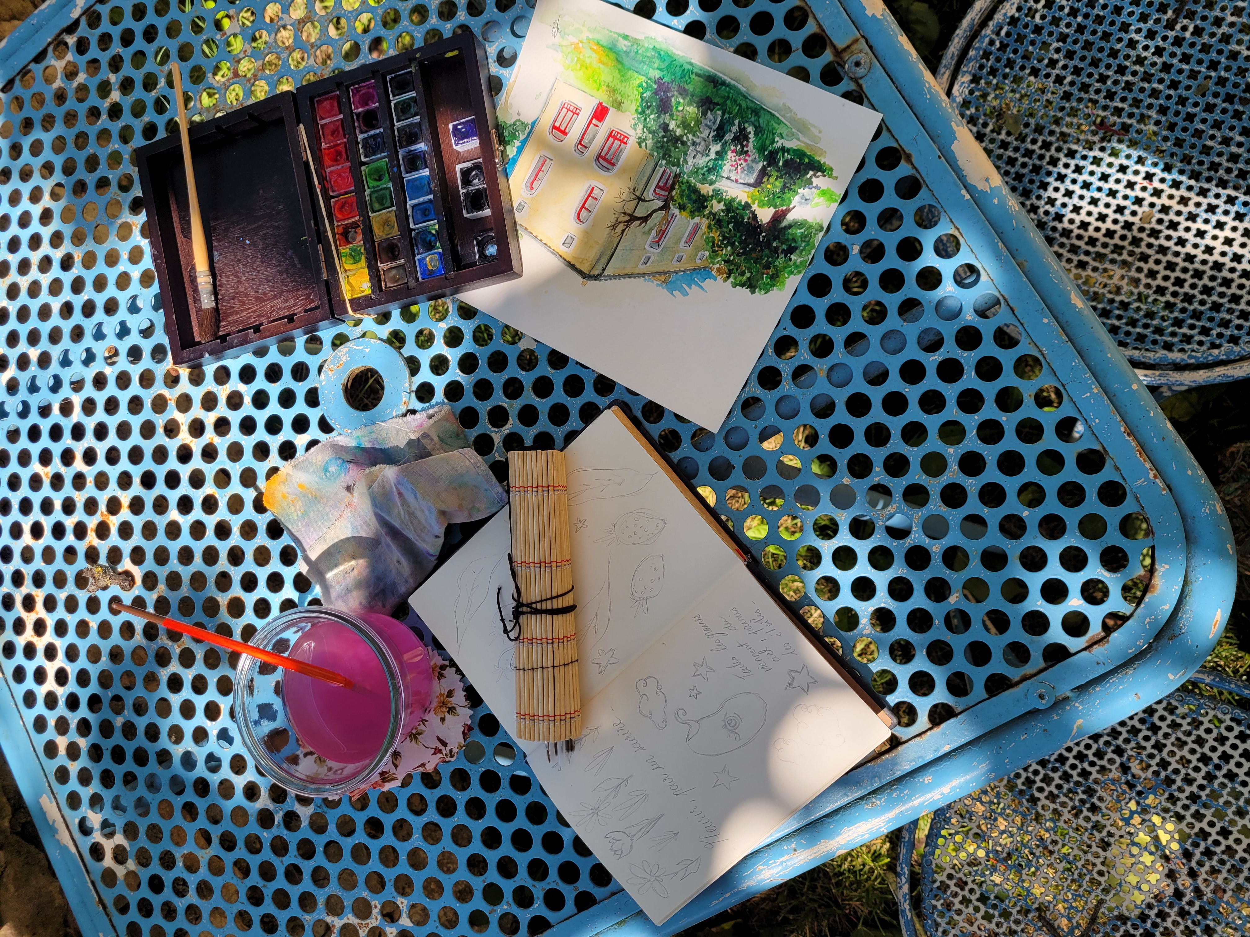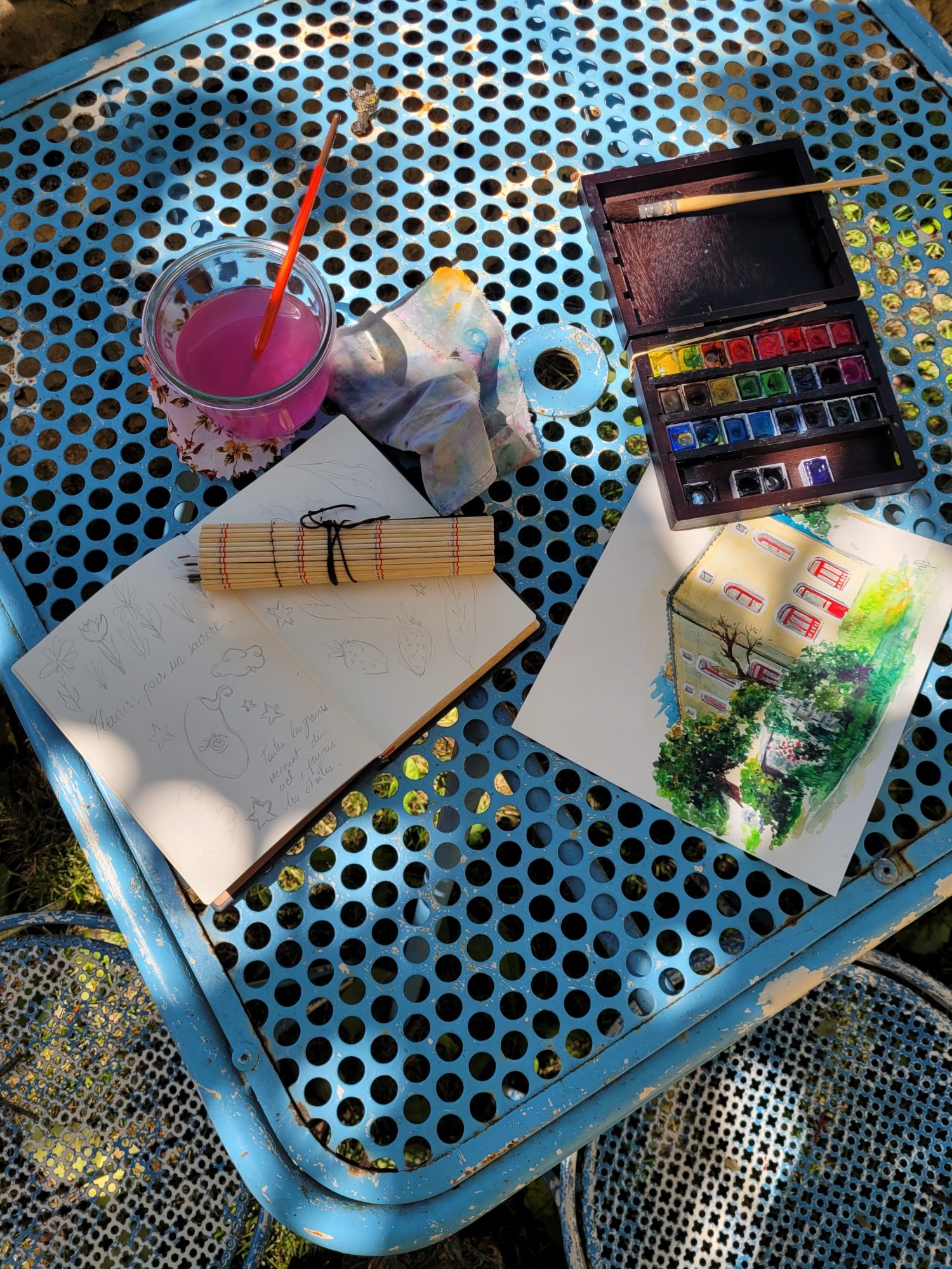 Autour du thème “Cette nature en moi”, balade d’inspiration, exploration de différentes techniques artistiques (aquarelle, collage, pastels…), réalisation d’un carnet de croquis… et partage de moments conviviaux pour les repas.