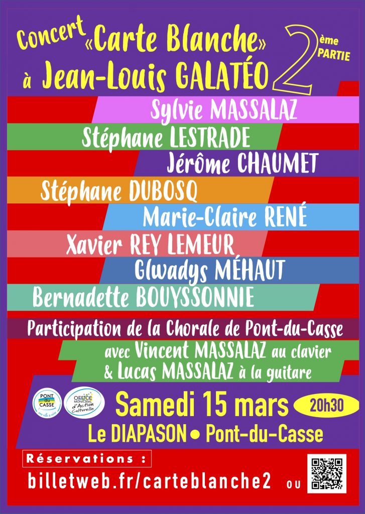 Fort de la belle réussite de l’année dernière, l’OMAC (Office Municipal d’Action Culturelle de Pont-du-Casse) a demandé à Jean-Louis Galatéo de créer un nouveau spectacle. 8 artistes ont répondu positivement à ce projet et vous les retrouverez tous sur la scène du Diapason le samedi 15 mars à 20h30.