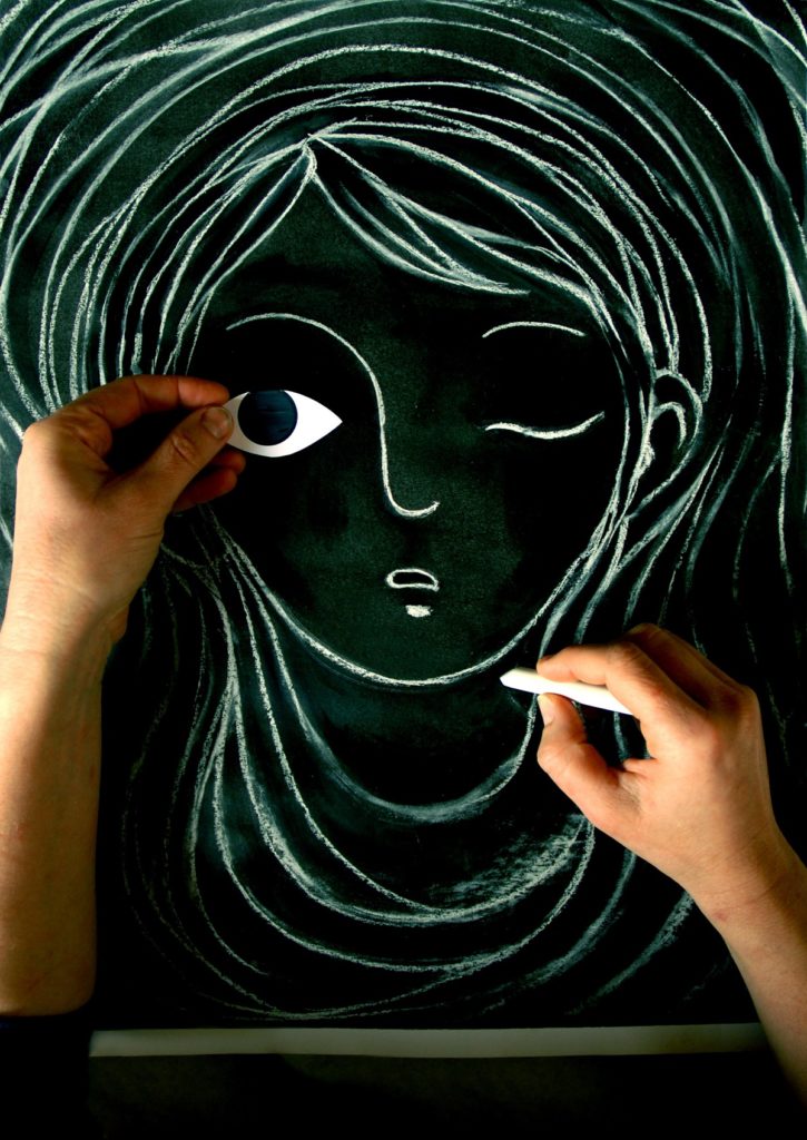 Sur le plateau, l’illustratrice dessine, découpe et peint, invitant à un voyage à travers les outils d’expression graphique. La musique, interprétée en direct, propose un univers à la croisée de chants minimalistes, lyriques et populaires.