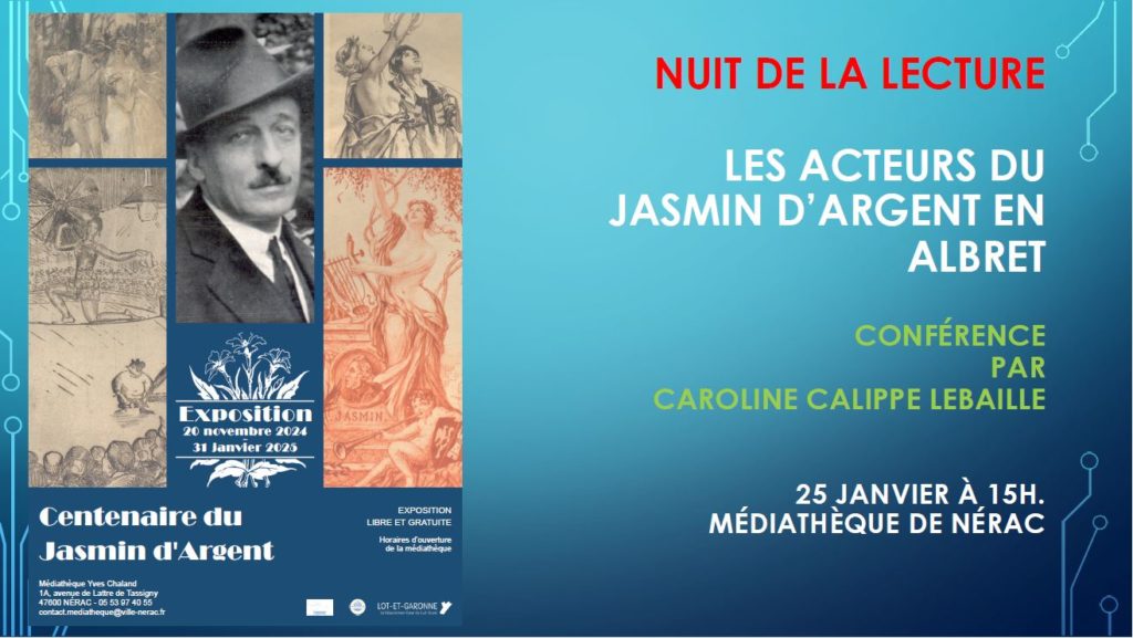 A l’occasion de son centenaire, les Archives départementales et la société du Jasmin d’argent se sont associées pour créer une exposition itinérante qui propose au public une plongée dans un siècle de poésie, à travers l’histoire du Jasmin d’argent : la figure de ses fondateurs, l’organisation de bals et de soirées de gala de poésie dans des châteaux lot-et-garonnais dans les années 1920 et 1930, l’édition de livrets illustrés reprenant le palmarès annuel, le prix de poésie française (et son histoire), le prix de poésie occitane, le prix de la francophonie, les invités d’honneur et personnalités littéraires à la remise des prix, les présidents, les personnalités membres du jury… et bien sûr quelques-unes des figures de lauréats parmi les plus marquantes.