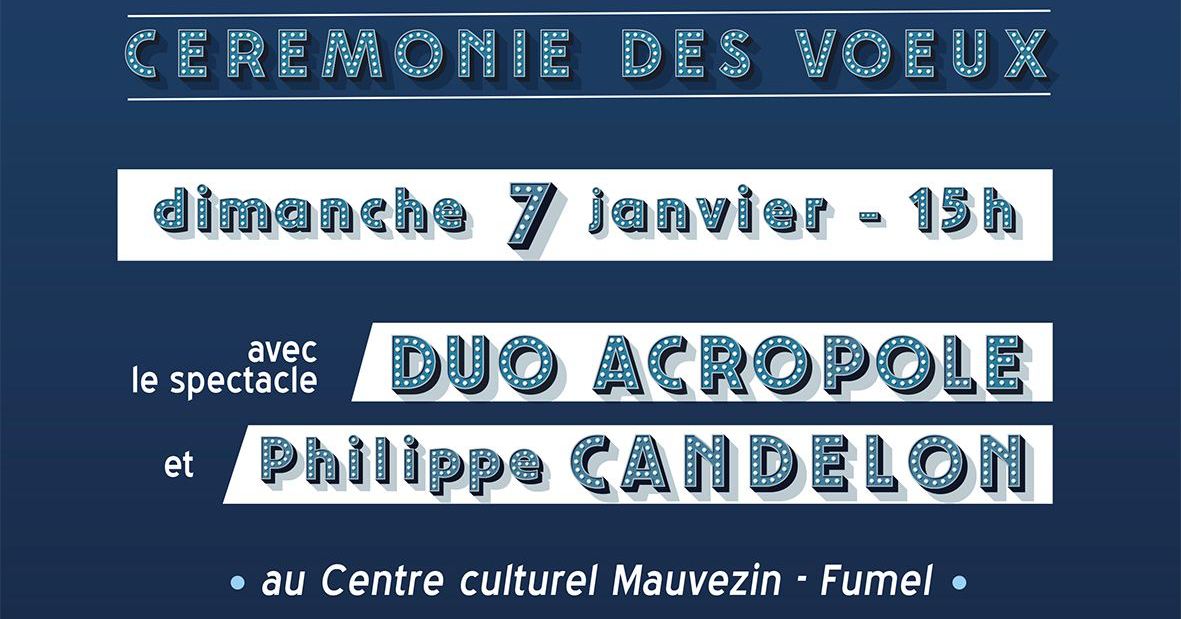 Cette cérémonie sera l’occasion de revenir sur les réalisations de l’année 2023 et sur les projets de l’année 2024. Cette année le Duo Acropole propose un spectacle d’acrobaties, ballet aérien, plein de poésie et d’élégance. Il sera accompagné par Philippe Candelon et Jeanne Rottier Bobbato, qui proposeront un tour de chant festif, pour un après-midi enchanté. Le cidre et la galette seront offerts aux spectateurs à l’issue du spectacle.