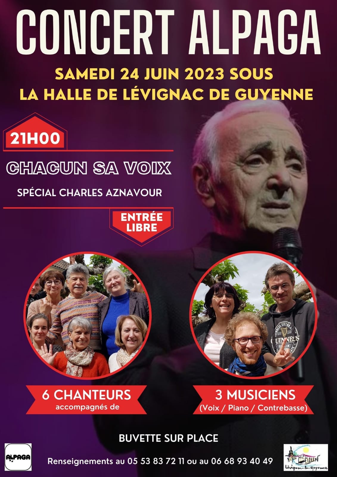 Concerts chacun sa voix Spécial Aznavour La Halle - Saint-Géraud Le Bourg Saint-Géraud Voir tous les événements se déroulant ici le 24 juin 2023 A 21h Entrée libre Proposé par l’association Alpaga. ALPAGA 05 53 83 72 11 - 06 68 93 40 49 contact@alpaga.org
