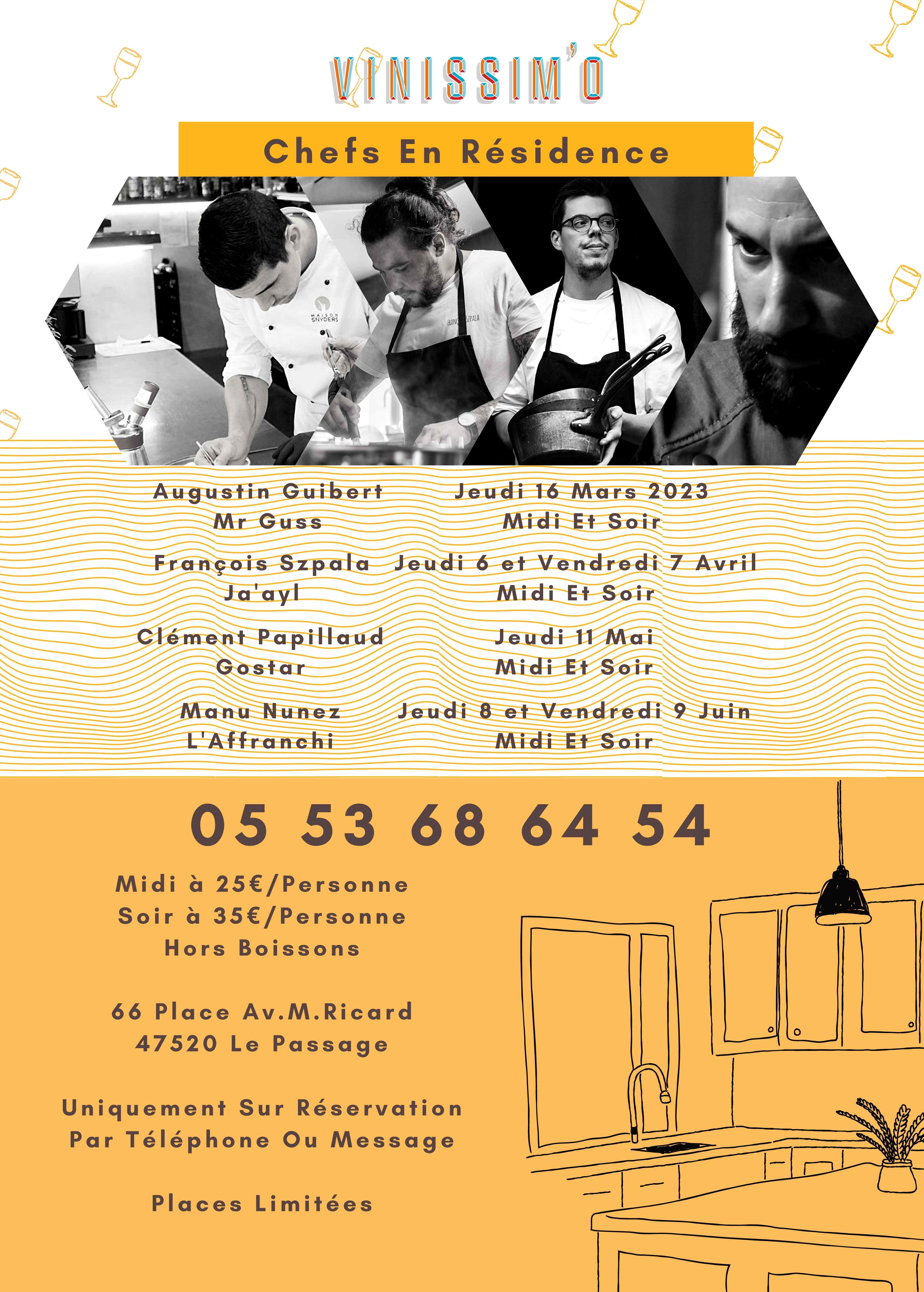 Le premier Chef a entrer en scène sera Augustin Guibert du Restaurant Mr Guss à Nérac le Jeudi 16 Mars midi et soir.