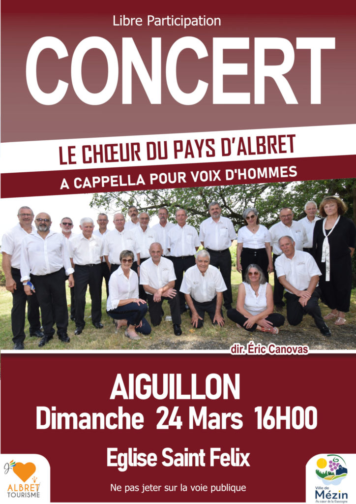 C’est à Aiguillon, le dimanche 24 mars, que le Chœur du Pays d’Albret retrouvera la route des concerts, après une longue et nécessaire trêve hivernale.Une période sans concerts n’est pas pour autant une période sans travail. Au contraire, cette interruption a été mise à profit pour peaufiner un répertoire faisant une large place aux nouveautés. Elle aura aussi favorisé l’intégration de quelques nouveaux membres.Ces renouvellements ne remettent nullement en cause les constantes qui président à la vie de cette formation. Le chant « a cappella », c’est-à-dire sans accompagnement musical, reste la règle qui ne souffre pour l’heure d’aucune exception. Les chants sont harmonisés pour voix d’hommes. La présence d’éléments féminins, venus renforcer le groupe, ne doit pas faire illusion : ces dames interprètent des partitions de ténors. Enfin, le Chœur du Pays d’Albret conserve un répertoire d’une grande diversité, auquel le public souscrit largement : du chant grégorien du Haut Moyen-Age à la variété contemporaine, en passant par les périodes baroque puis romantique, le spectateur est convié à véritable panorama du chant choral à travers les siècles et les pays .