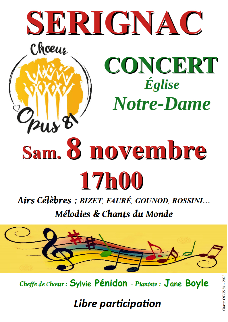 Habitué à chanter en Pays d’Albret, notre Chœur néracais créé en 1981, investit l’église Notre-Dame de Sérignac-sur-Garonne Samedi 8 novembre à 17h00, pour y faire résonner des Airs Célèbres du répertoire classique et des Chants du Monde.