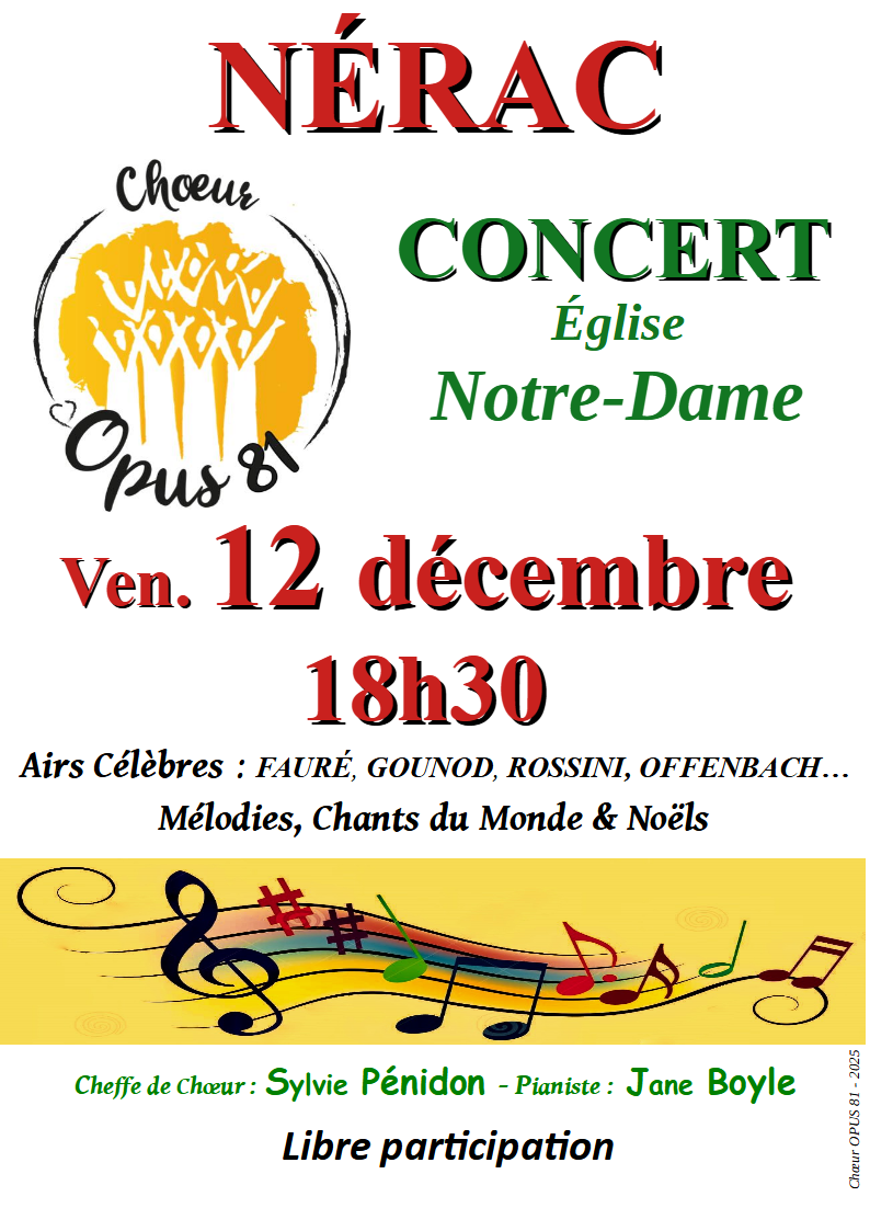 Fidèle à son public de Nérac & du Pays d’Albret, notre Chœur néracais créé en 1981, investit l’église Notre-Dame de Nérac, pour fêter la fin d’année, vendredi 12 décembre 2025 à 18h30, en y faisant résonner des chants du Monde, des airs du répertoire sacré & classique, mais aussi des chants de Noël.