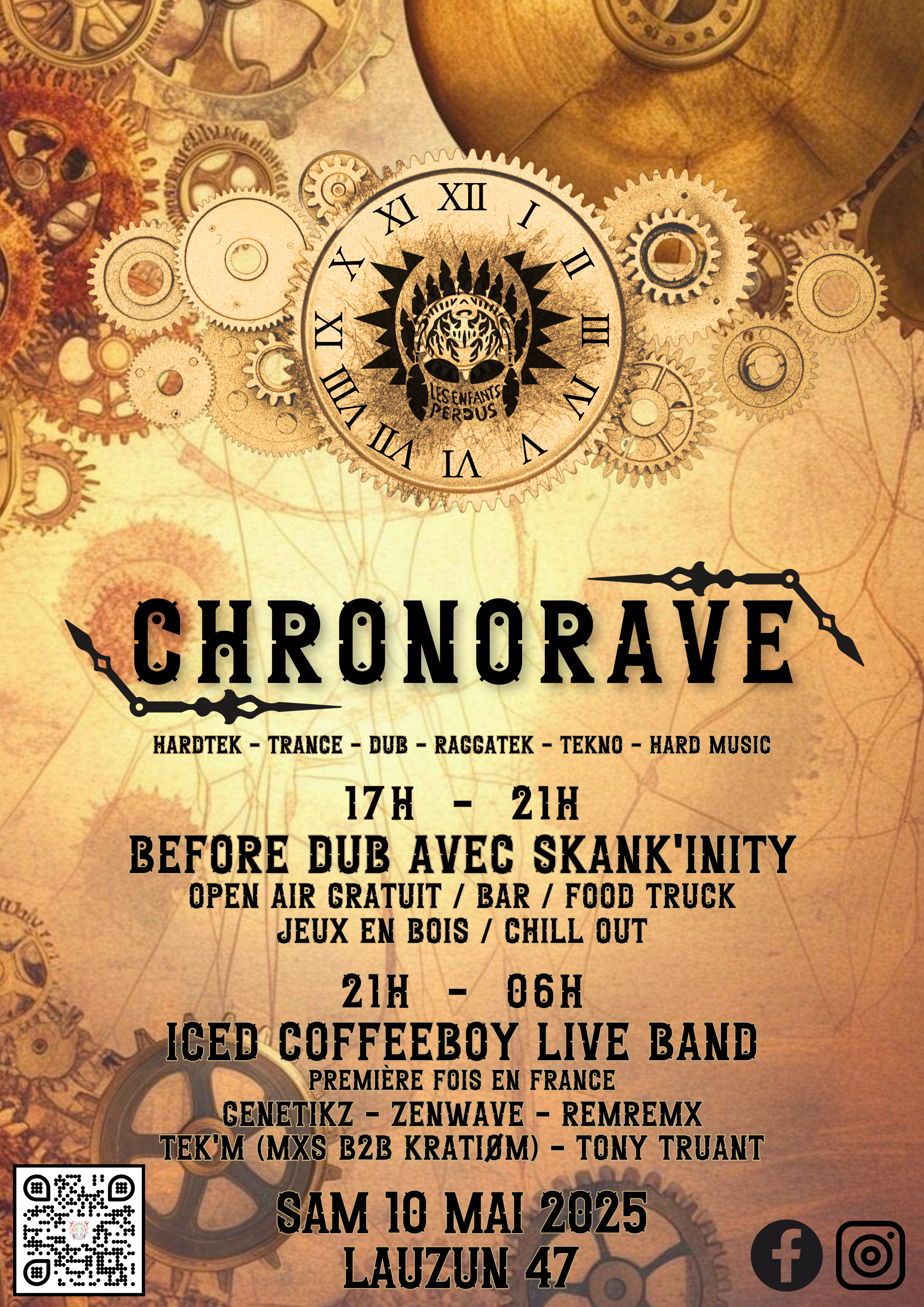 Le 10 mai à Lauzun, embarquez pour une expérience hors du temps ! Chronorave, c’est bien plus qu’une soirée électronique : c’est une faille temporelle que les Enfants Perdus ont ouverte juste pour vous !
