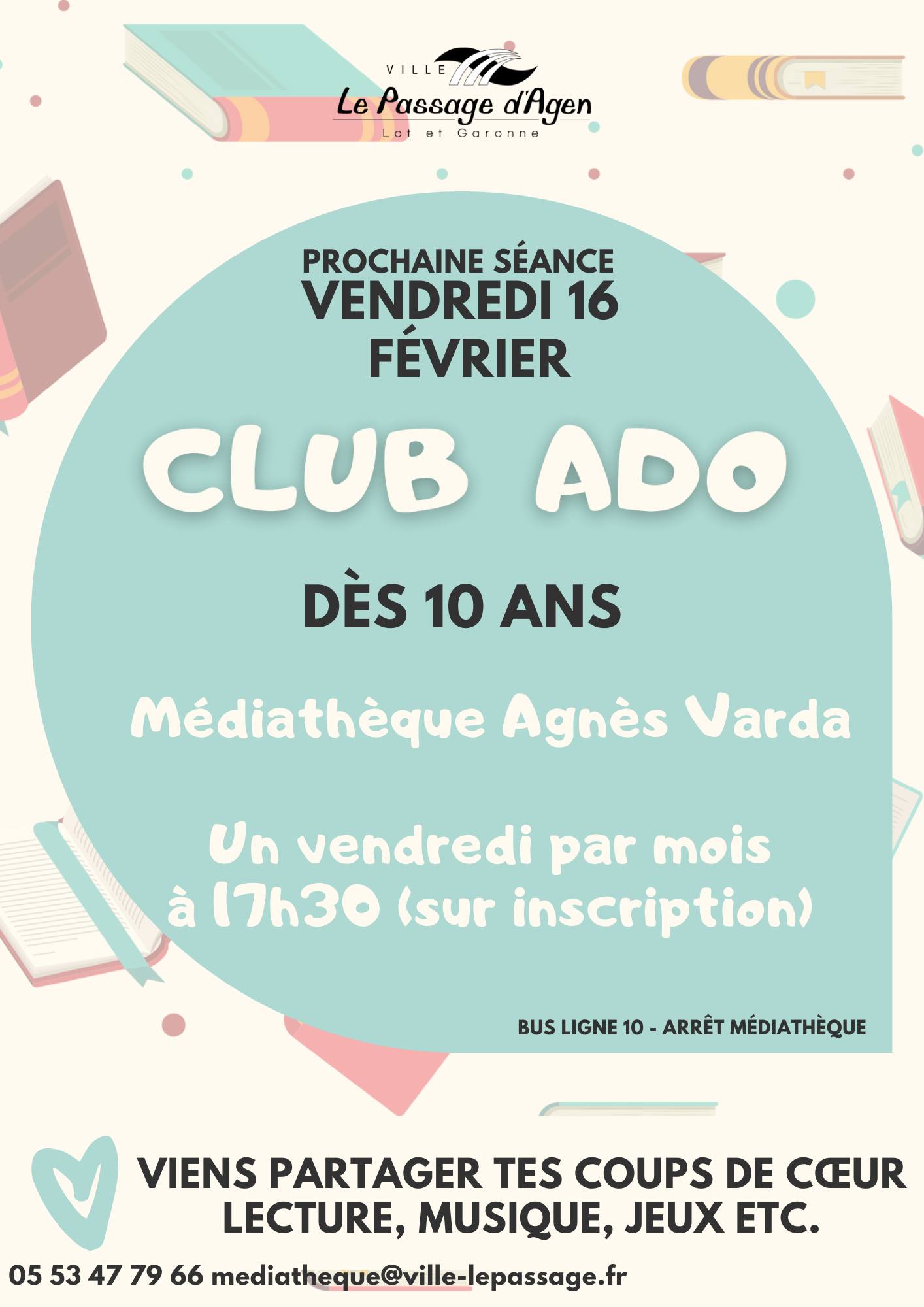 La Médiathèque municipale vous invite à la prochaine séance du Club Ado, le vendredi 16 février prochain à 17h30.