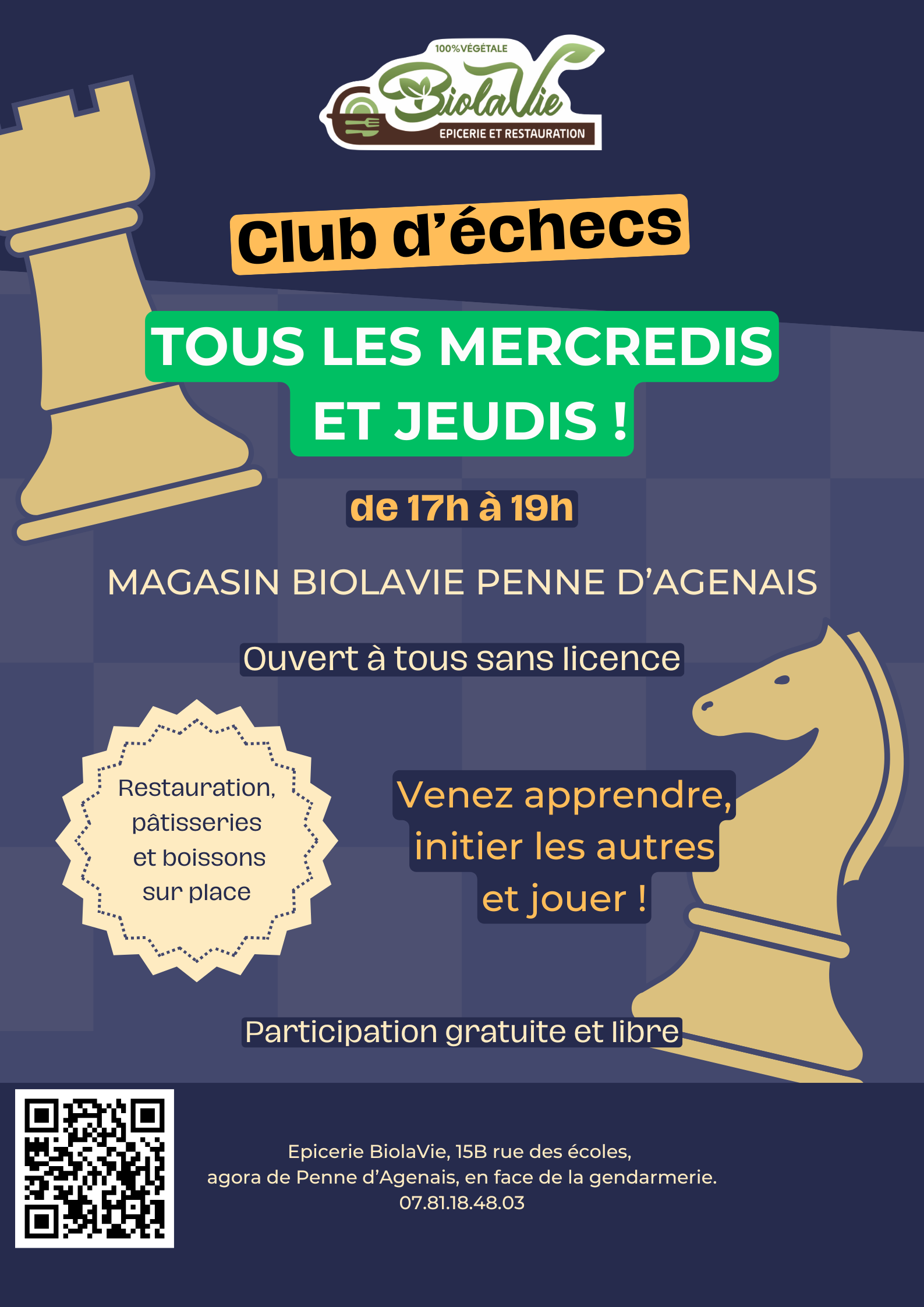 Tous les mercredis et jeudis, BiolaVie vous propose de découvrir les échecs et de jouer contre d’autres amateurs !