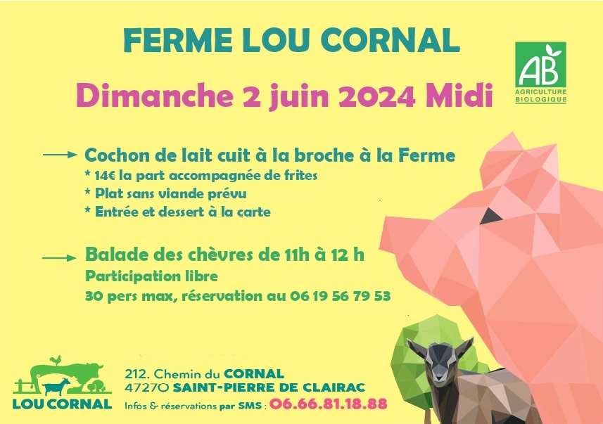 – 12h: Repas cochon de lait cuit à la broche: Réservation obligatoire au 06 66 81 18 88 (nombre de places limité)