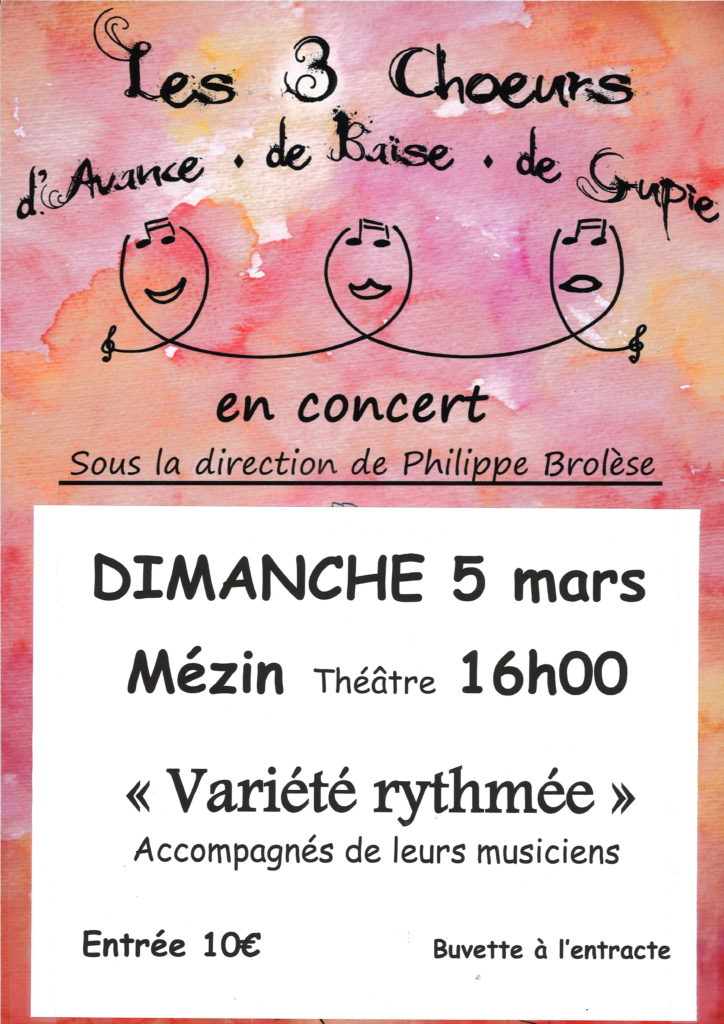 La Chorale Les 3 Choeurs dirigée par Philippe Brolèse, professeur à l’école des musiques de Casteljaloux, donne un concert de chants variés et contemporains sur des rythmes gipsy, latino, merengue etc … Les choristes seront une cinquantaine sur scène.