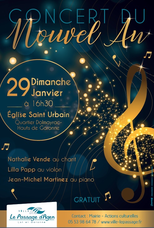 Concert pour célébrer la Nouvelle Année, le dimanche 29 janvier, Eglise Saint Urbain, quartier de Dolmayrac au Passage d’Agen.