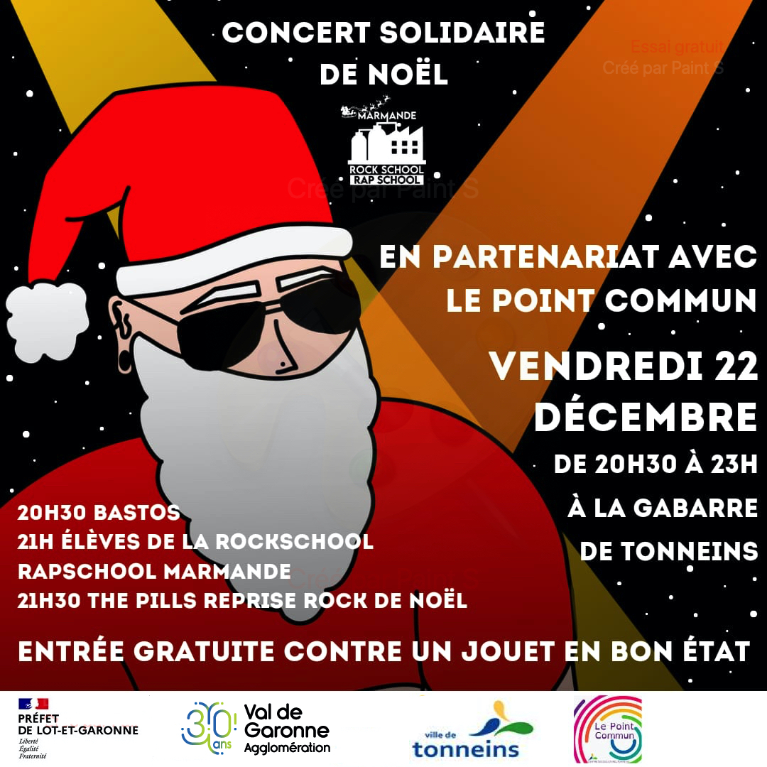 La Rockschool Rapschool Marmande, en partenariat avec la Ville de Tonneins et « le Point Commun » vous invite à un concert de Noël solidaire qui aura lieu le vendredi 22 décembre à 20h30 dans la salle de la Gabarre (centre culturel Paul Dumail).