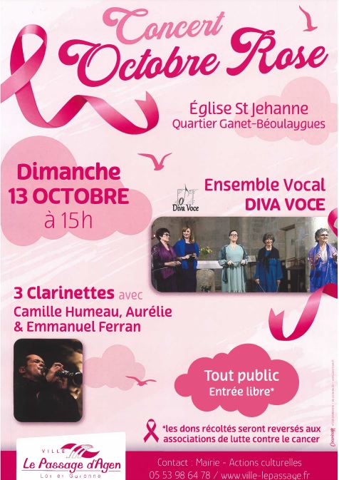 Assistez à un beau concert avec l’ensemble Diva Voce et le groupe « 3 Clarinettes », le dimanche 13 octobre 2024 à 15h, en l’église Sainte-Jeanne (quartier de Ganet). Après le concert, partagez un moment convivial autour de la buvette et des stands d’Octobre Rose. L’entrée est libre et les fonds de la buvette soutiendront la cause.