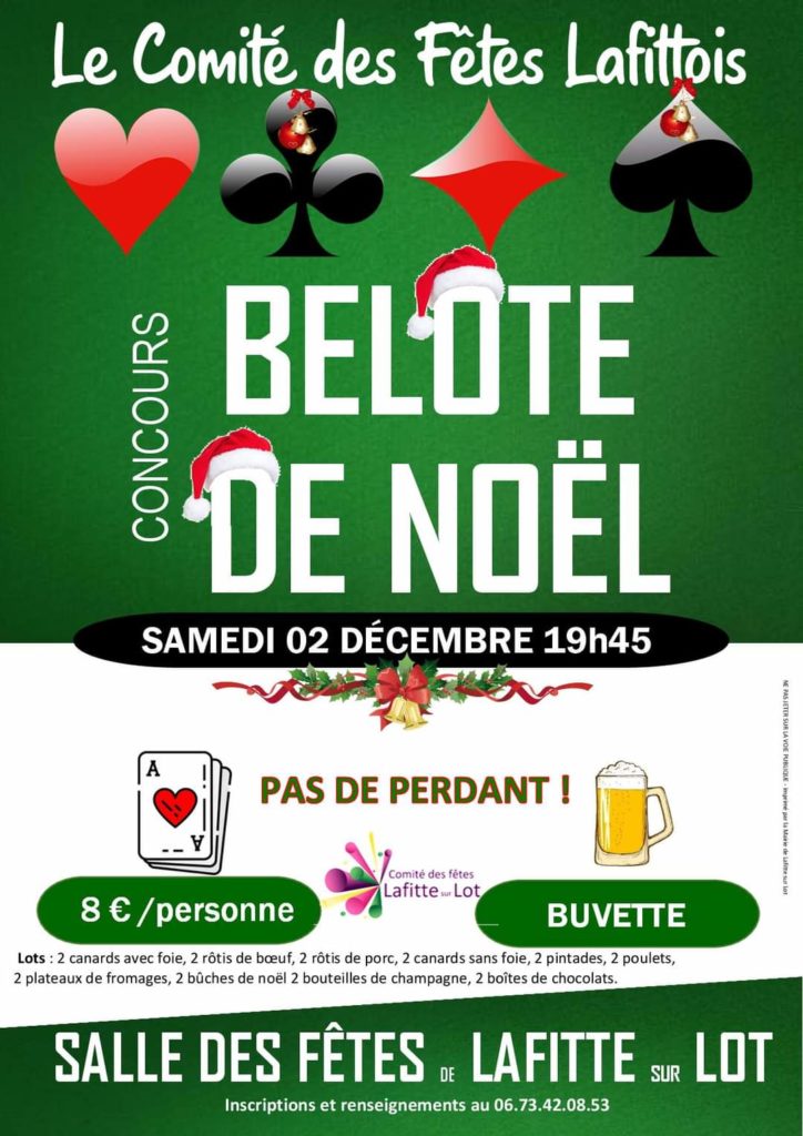 Le Comité des Fêtes organise son concours de Belote de Noël par équipe.Pas de perdants … De nombreux lots à gagner !