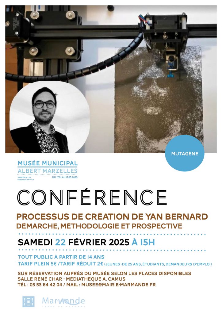 Dans le cadre de l’exposition Mutagène au musée Albert Marzelles, une conférence sur le processus de création de l’artiste Yan Bernard sera organisée. Il y abordera sa démarche, sa méthodologie et ses perspectives d’évolution.