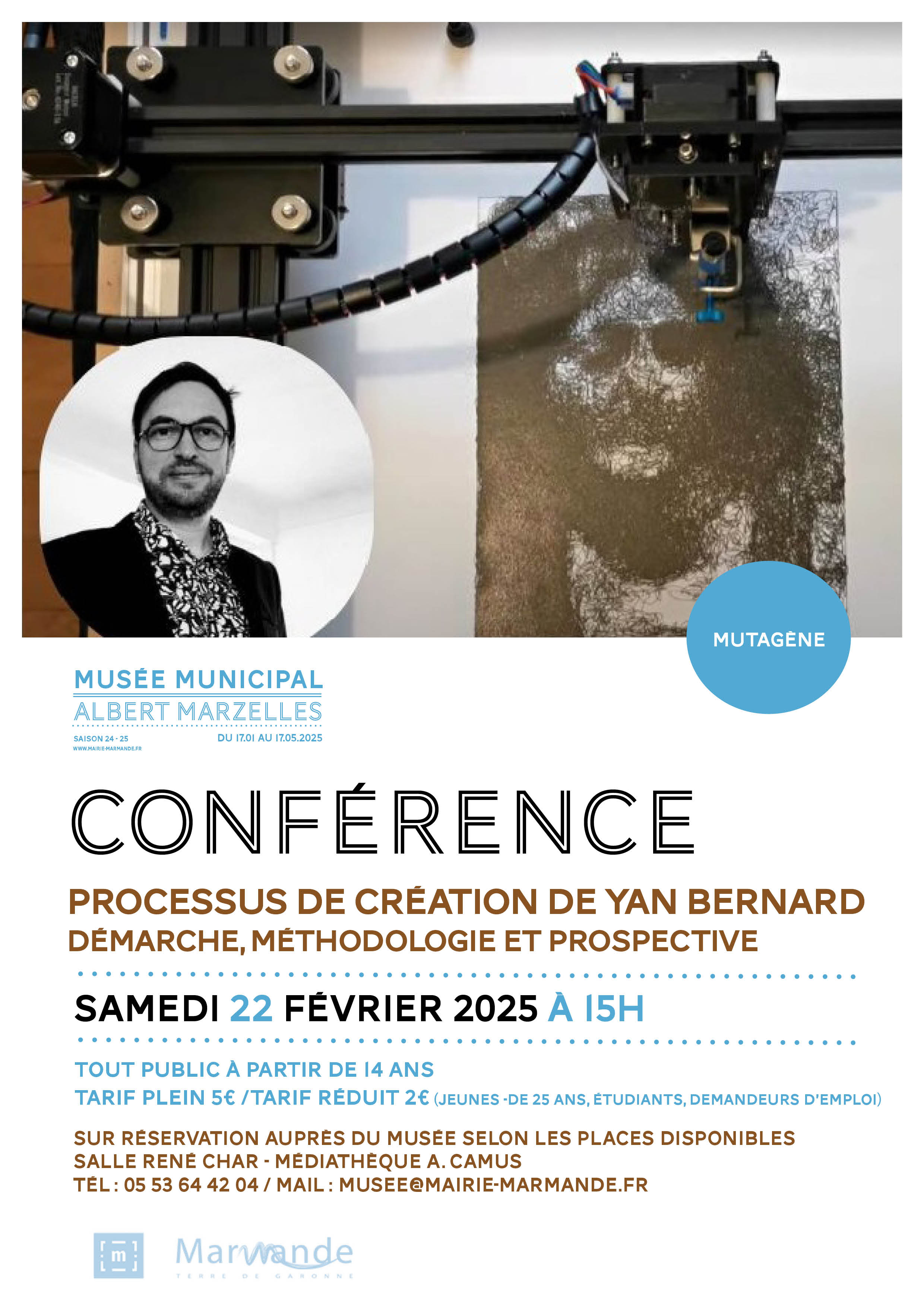 Dans le cadre de l’exposition Mutagène au musée Albert Marzelles, une conférence sur le processus de création de l’artiste Yan Bernard sera organisée. Il y abordera sa démarche, sa méthodologie et ses perspectives d’évolution.