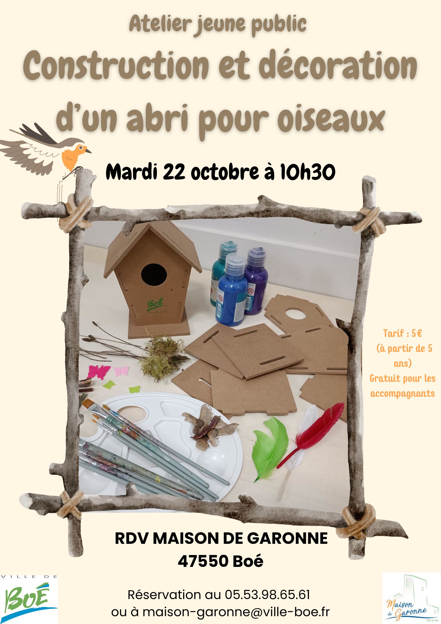 Mardi 22 octobre à 10h30 : Atelier jeune public de construction et décoration d’un abri pour oiseaux.