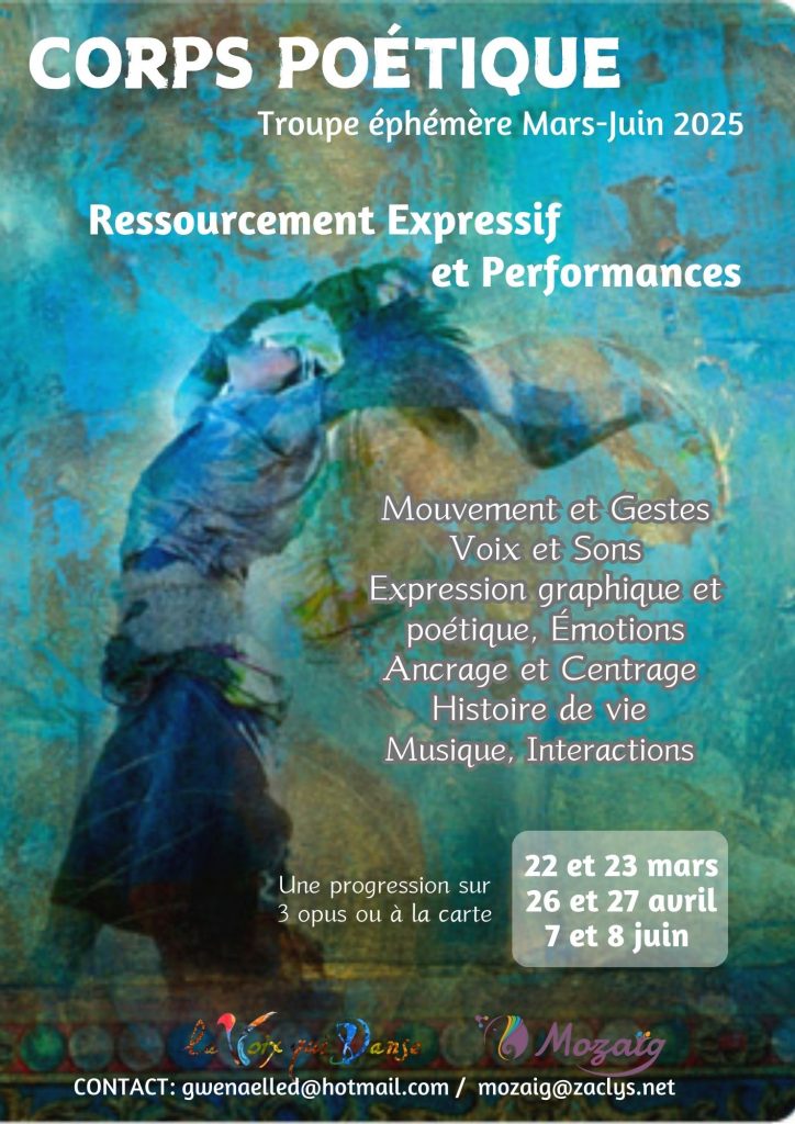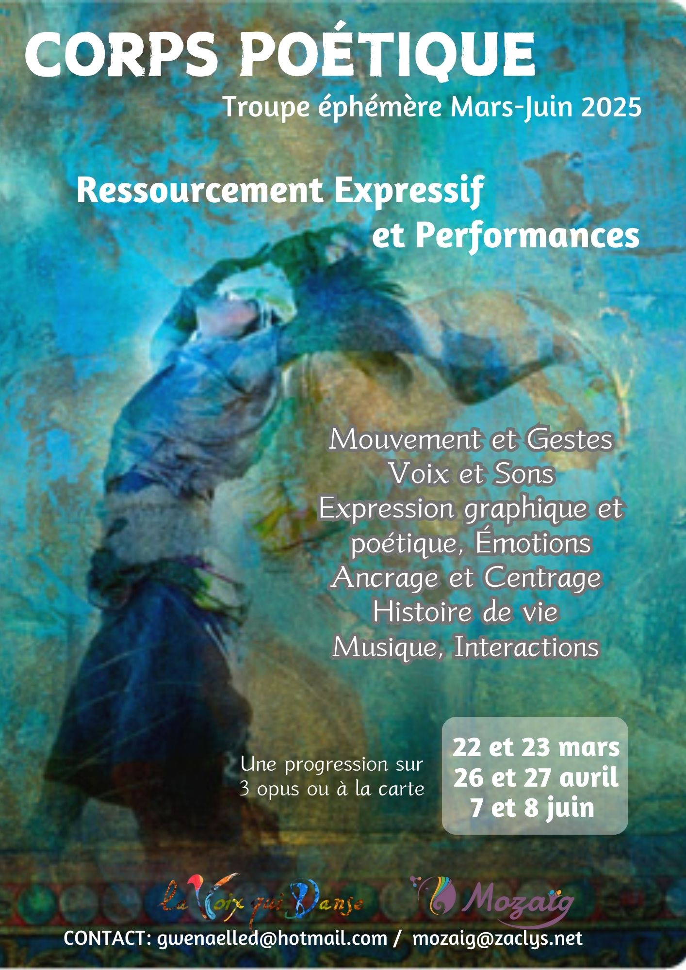 La troupe Corps Poétique réunit ceux et celles qui ressentent l’envie de développer leur expressivité, corporelle et poétique, avec l’intention de montrer leurs sensibilités et leur rapport au monde en ayant conscience d’être vu.e, regardé.e dans cette démarche sensible.
