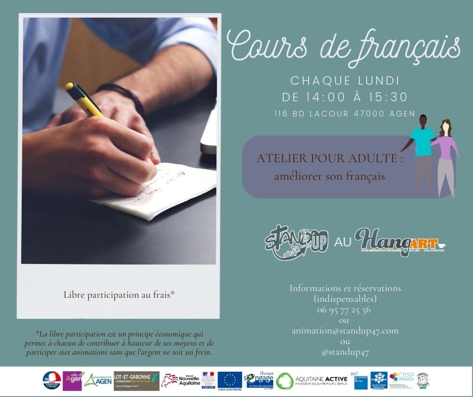 Loisirs Cours de Français Le Hang'art - Agen 116 Boulevard Edouard Lacour Agen Voir tous les événements se déroulant ici le 24 avril 2023 De 14h à 15h30 Libre Participation Venez améliorer votre français ! Stand'UP 06 95 77 25 56 animation@standup.com