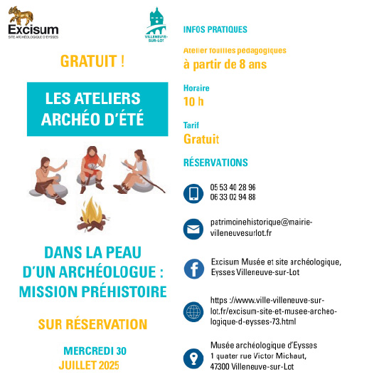 Pour les vacances d’été, le musée archéologique d’Eysses invite les enfants à partir de 8 ans et leurs familles à deux ateliers « Dans la peau d’un archéologue : Mission Préhistoire ».