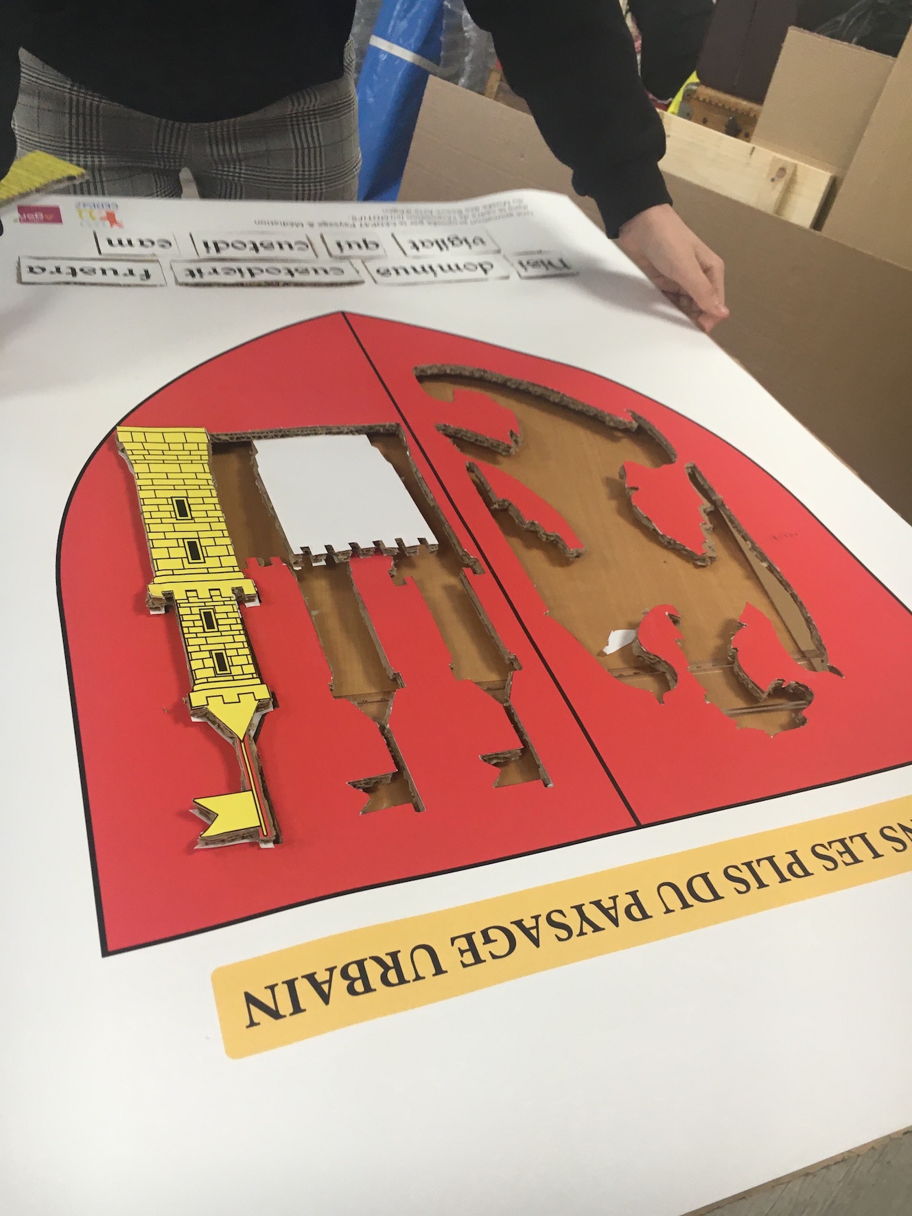 En prolongement de l’exposition leitMOTIFS, le Musée des Beaux-Arts d’Agen programme une animation concoctée par le CEDP47 : un jeu de piste « dans les plis du paysage urbain ». Venez jouer à observer les signes dans la ville d’Agen !Noémie, en mode préparation pour les animations des vacances scolaires, finalise la conception des supports de jeux !Décomposer pour recomposer une identité à la ville… née de la créativité des participants ! L’idée du jeu : reconstituer un blason de la ville, à partir des signes à repérer dans la ville.