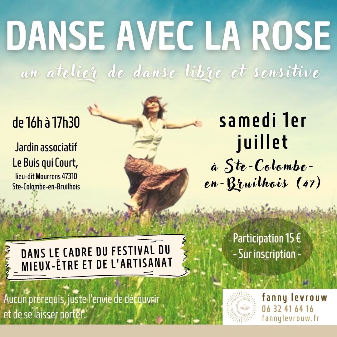 Dans le cadre du Festival du Mieux-être et de l’Artisanat, et à l’invitation de l’Association Les Petits Grains 47, je vous propose de nous retrouver ce samedi pour un atelier de danse libre et sensitive à la rencontre de la Rose, de 16h à 17h30 au Jardin associatif Le Buis qui court, lieu-dit Mourrens 47310 Ste-Colombe-en-Bruilhois.