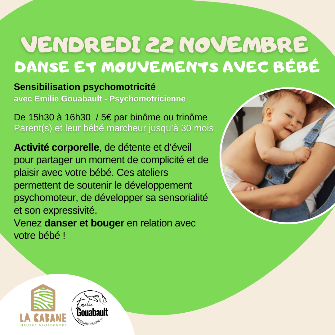 Emilie Gouabault exerce à l’espace de santé des Haras et a suivi une formation spécifique pour accompagner les jeunes parents et leur bébé à travers le mouvement et le lien spécial qu’il permet de favoriser. Elle développe cette approche douce et innovante à travers ses ateliers à la Cabane.