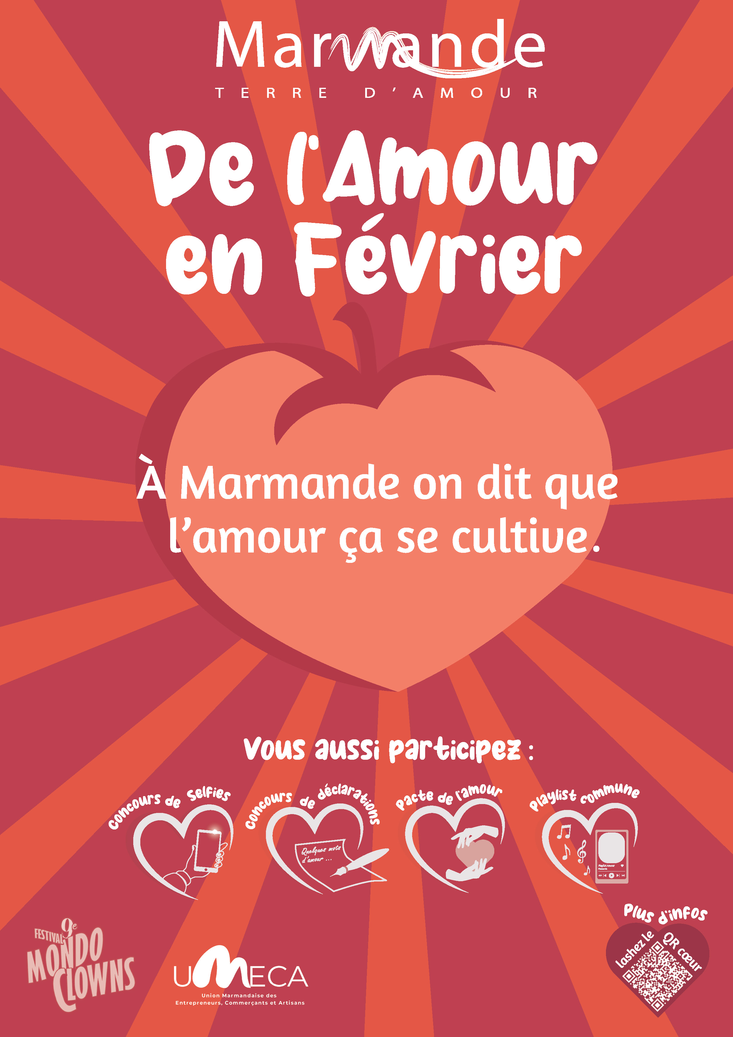 - Concours de selfies : prenez-vous devant les coeurs rouges disposés en ville et envoyez le par mail : terredamour@mairie-marmande.fr.