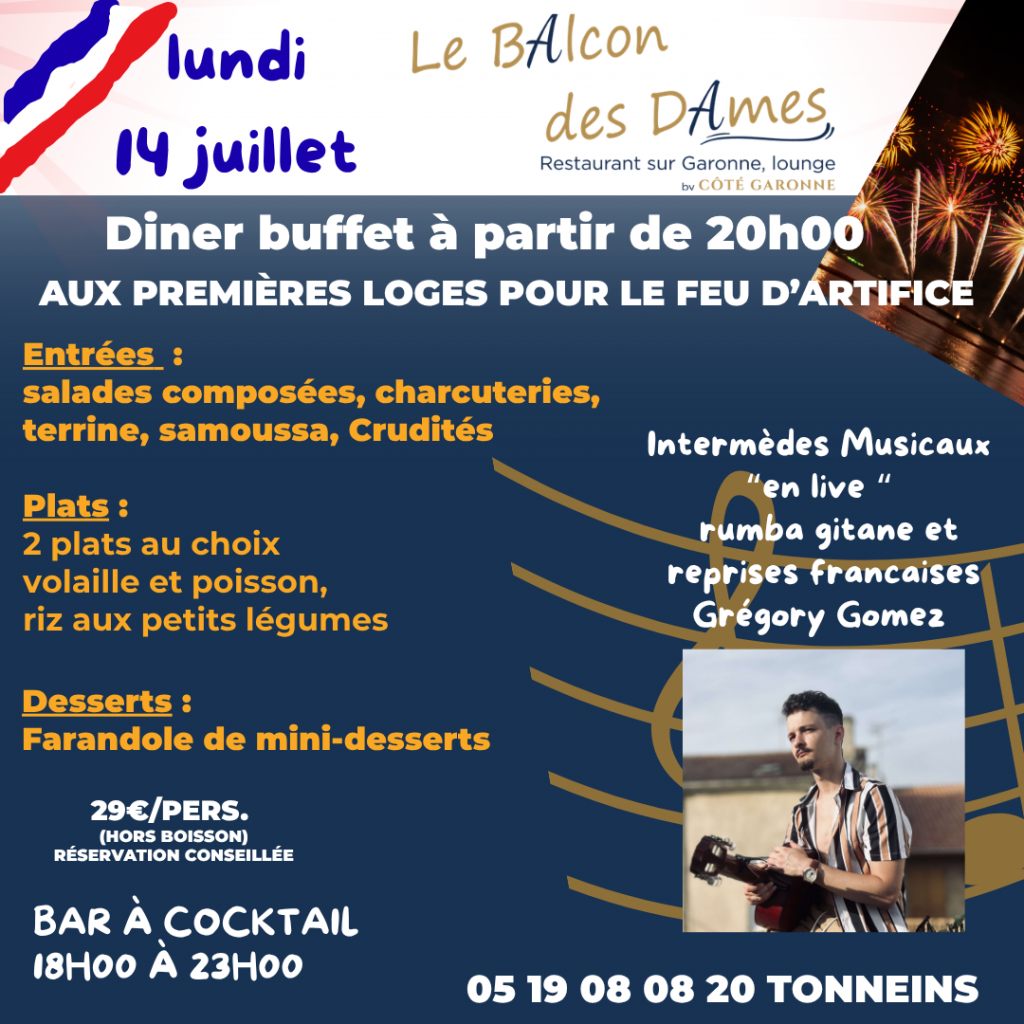 Venez profiter d’un dîner buffet à 29€ / personne au Balcon des Dames, pour être aux première loges du feu d’artifice du 14 juillet de Tonneins (depuis les balcons, avec une vue imprenable).