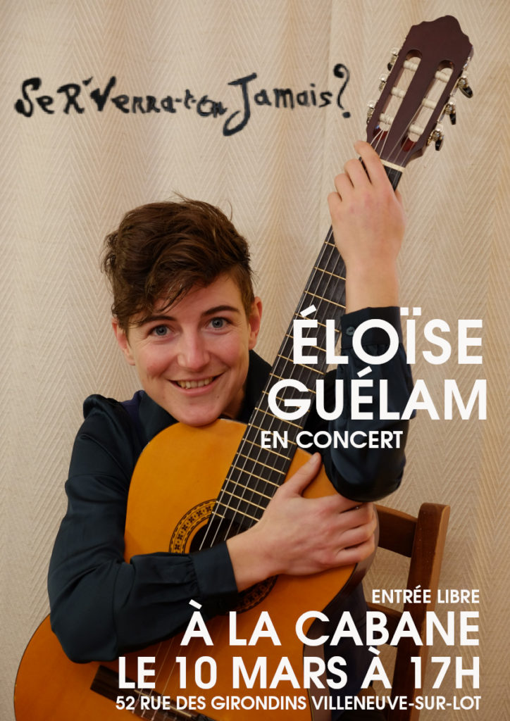 Inspirée par Mano Solo, Colette Magny, Anne Sylvestre, …, Eloïse Guélam chante son répertoire de chansons françaises qu’elle accompagne à la guitare, le dimanche 10 mars, à La Cabane, dans le cadre du Printemps des Poètes.