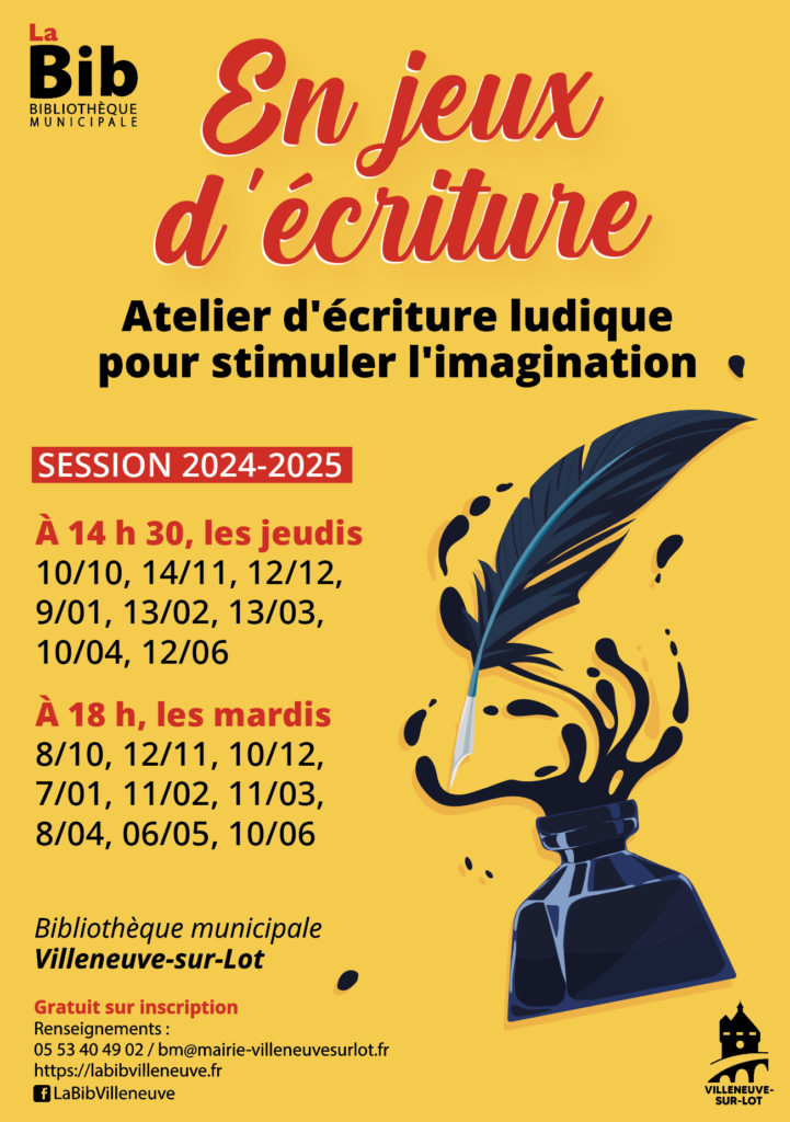 Envie de jouer avec les mots et les sons, la bibliothèque de Villeneuve sur Lot vous propose des ateliers d’écriture 2 créneaux possible : mardi à 18h ou jeudi à 14h30.