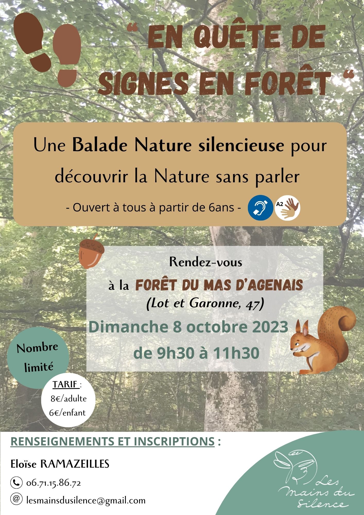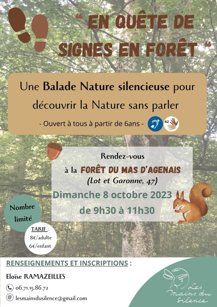 Imaginée et conçue pour être accessible aux personnes sourdes et malentendantes, cette balade silencieuse vous invite à la rencontre d’un monde visuel et émotionnel. Nous explorerons différents modes de communication : Langue des Signes Française (LSF), expression corporelle, image, dessin, toucher, etc…