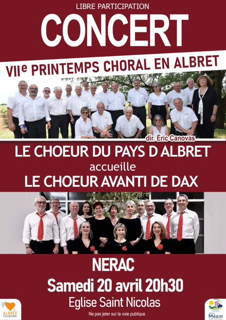 Pour la VIIème édition de son Printemps Choral, le Chœur du Pays d’Albret reçoit l’ensemble vocal Avanti, de Dax.Ce groupe, composé de 14 choristes, 7 femmes et 7 hommes, interprète « a cappella » un répertoire varié passant par le classique, le chant sacré, la chanson française, abordant la variété internationale, les horizons d’Amérique Latine ou même d’ethnies éloignées.Dirigé par Pierre Marti, un chef dynamique, enthousiaste et toujours à la recherche de nouveaux horizons musicaux, AVANTI va de l’avant, comme son nom l’indique, ose, propose et tient une place singulière dans l’univers du chant choral.Sous la direction de son chef historique, Eric Canovas, le Chœur du Pays d’Albret apportera sa contribution au riche panorama du chant choral, avec de nouveaux titres et de nouvelles interprétations.C’est donc un double concert qui est proposé dans l’église Saint-Nicolas de Nérac. Une soirée de haute tenue pour laquelle le public est espéré nombreux.