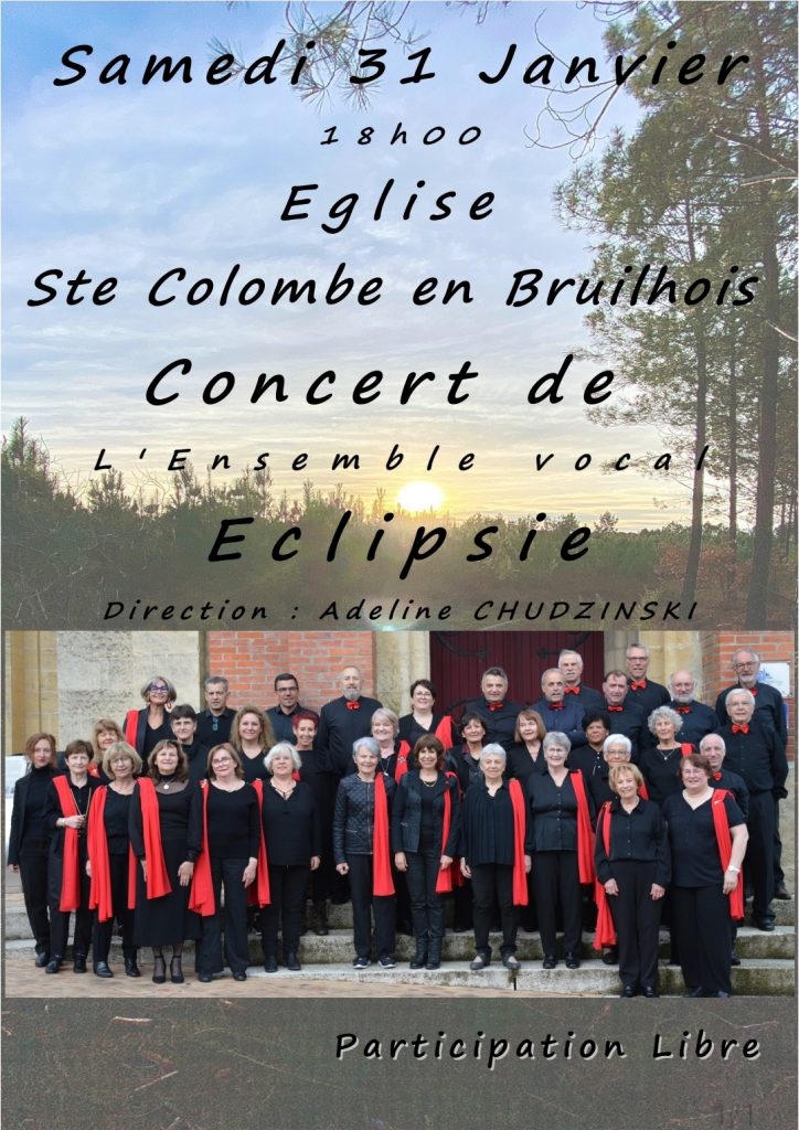 Samedi 31 janvier, rendez-vous à 18H en l’église de Sainte Colombe-en-Brulhois avec la chorale Éclipsie qui aura le plaisir de vous proposer des chants très variés !