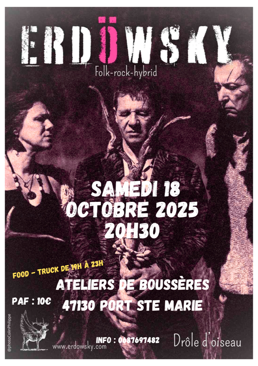 Concerts Erdöwsky Concert Rock Association Les Ateliers de Boussères - Port-Sainte-Marie 122 Impasse de Boussères 47130 Port-Sainte-Marie Voir tous les événements se déroulant ici le 18 octobre 20h30 (Food Truck à partir de 19h) 10€ Poésie Rock et chansons nomades. Association Les Ateliers de Boussères 06 87 69 74 82 adb47130@gmail.com