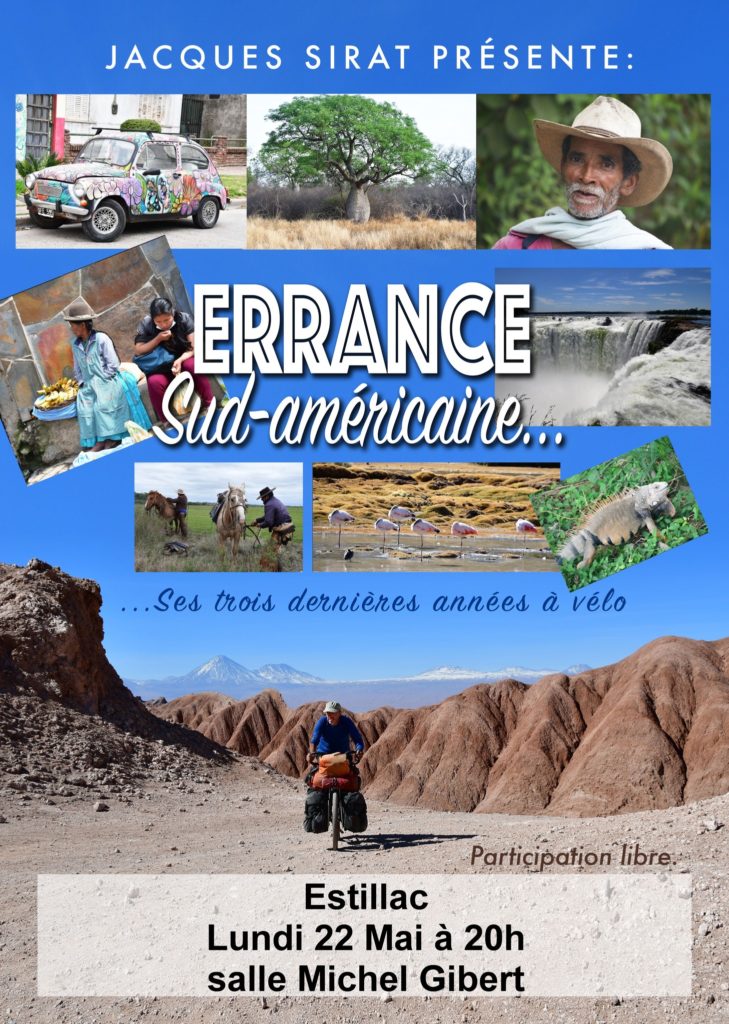 Le lundi 22 mai à 20h, le Comité des fêtes d’Estillac organise une projection-conférence de Jacques Sirat sur son dernier périple cyclotouristique en Amérique du sud.