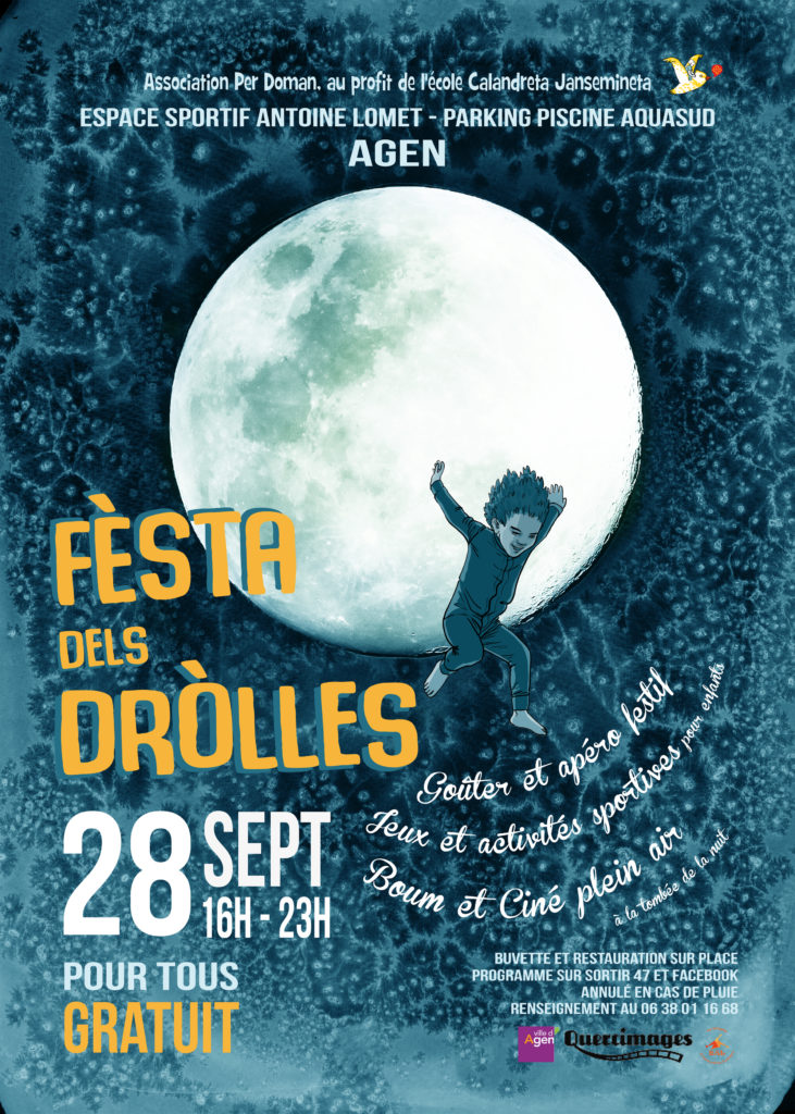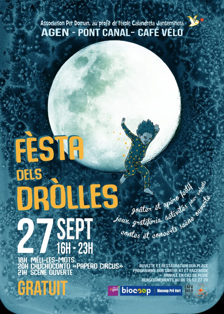 L’association Per Doman, en partenariat avec la Ville d’Agen et le Café-vélo, organise la « Fèsta dels dròlles » le Samedi 27 Septembre de 16h à 23h au Café-vélo à Agen.